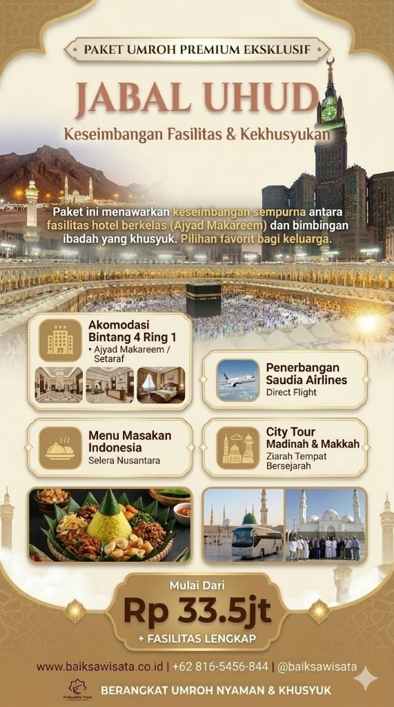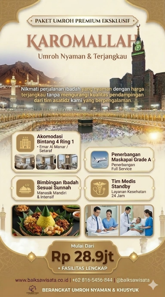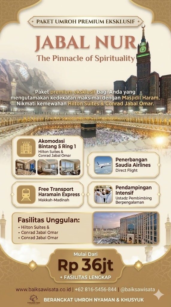 Paket ini menawarkan keseimbangan sempurna antara fasilitas hotel berkelas (Ajyad Makareem) dan bimbingan ibadah yang khusyuk. Pilihan favorit bagi keluarga.