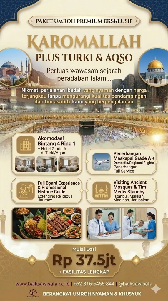 Nikmati perjalanan ibadah yang nyaman serta eksplorasi sejarah peradaban Islam di Turki atau Masjidil Aqso dengan pengalaman spiritual yang mendalam.